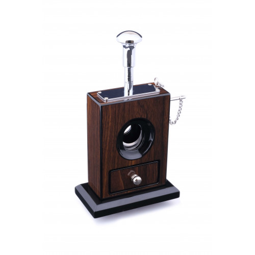 Уникальная настольная сигарная гильотина от итальянской компании Lubinski. В деревянный корпус встроен механизм двойного действия: с одной стороны это гильотина с 2 лезвиями, с другой — V-каттер типа «кошачий глаз». Для безопасности сбоку имеется стержневой стопор-предохранитель. Обрезанная сигарная шапочка падает внутрь корпуса в съемный лоток. Прекрасный сигарный аксессуар, который может быть как самостоятельным предметом интерьера, так и гармоничным дополнением к хьюмидору и/или настольной пепельнице.