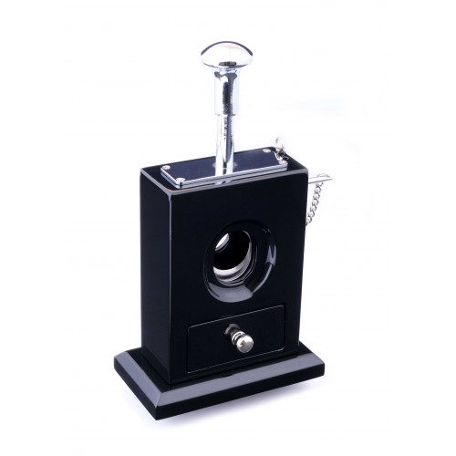 Уникальная настольная сигарная гильотина от итальянской компании Lubinski. В деревянный корпус встроен механизм двойного действия: с одной стороны это гильотина с 2 лезвиями, с другой — V-каттер типа «кошачий глаз». Для безопасности сбоку имеется стержневой стопор-предохранитель. Обрезанная сигарная шапочка падает внутрь корпуса в съемный лоток. Прекрасный сигарный аксессуар, который может быть как самостоятельным предметом интерьера, так и гармоничным дополнением к хьюмидору и/или настольной пепельнице.