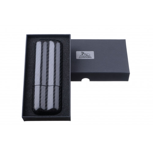 Эксклюзивный чехол для сигар от итальянской компании Lubinski SRL. Выполнен из карбонового волокна — почти невесомого, но особо прочного и красивого материала. Вмещает в себя сигары длиной до 19 см и диаметром до 2,7 см (ring gage 68) формата Пирамида, Коиба Бейке56, Черчилль или Торпедо. Фирменная подарочная упаковка.