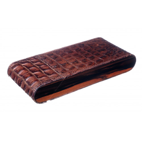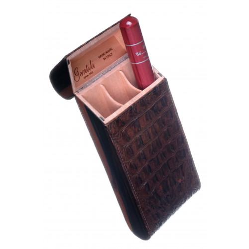 Чехол сигарный от Итальянской компании GENTILI, известной в сигарном мире своими хьюмидорами премиум-класса. Изготовлен из массива Испанского кедра с отделкой шпоном Эбенового дерева и телячей кожей с тиснением «Крокодил». Вмещает в себя 3 сигары длиной 6 1/2 дюйма и диаметром до 58 RG (формат Robusto).