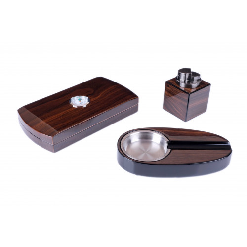 Настольный набор сигарных аксессуаров от итальянской компании Lubinski SRL, состоящий из трех предметов: хьюмидора для хранения сигар, пепельницы и зажигалки. Идеальный подарок для любого ценителя сигар.