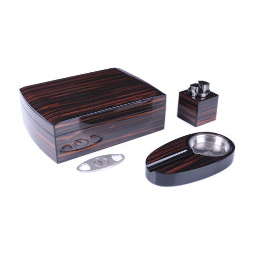 Настольный набор сигарных аксессуаров от итальянской компании Lubinski SRL, состоящий из 4 предметов: хьюмидора для хранения сигар, пепельницы, гильотины и мощной турбо-зажигалки с 4-мя форсунками. Настольные предметы выполнены из Индонезийского дерева Макассар. Идеальный подарок для любого ценителя сигар. Пепельница и гильотина лежат внутри хьюмидора, зажигалка упакована отдельно.