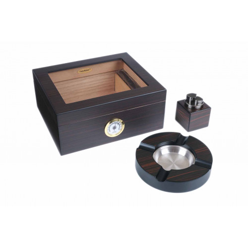 Набор сигарных аксессуаров тайваньской марки Tom River состоящий из хьюмидора для хранения сигар, пепельницы и мощной турбо-зажигалки с 4-мя форсунками. Идеальный подарок для любого ценителя сигар. Подробную информацию о каждом предмете из данного набора, а также его отдельной стоимости вы можете найти в соответствующей карточке этого товара на нашем сайте. Каждый предмет упакован отдельно в подарочную коробку.