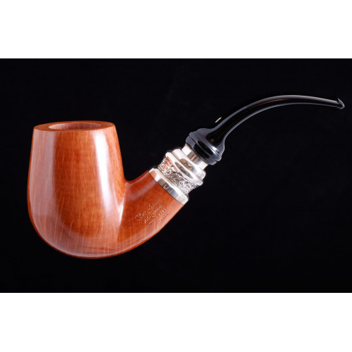 Трубка с классическими идеальными пропорциями высшего уровня Fiammata в классификации Ser Jacopo. Fiammata означает плотный равномерный рисунок «венатуры» бриара по всей чашке, похожий на пламя (la fiamma), что встречается довольно редко и ценится высоко. Экстраординарность трубки подчеркивается украшением мундштука драгоценным камнем (сапфиром) в серебряной оправе вместо обычной буквы J. Двойное кольцо на чубуке и мундштуке модели Pulchra (Пулькра) выполнено из массива серебра 925 пробы. Трубка выполнена в единственном экземпляре.
